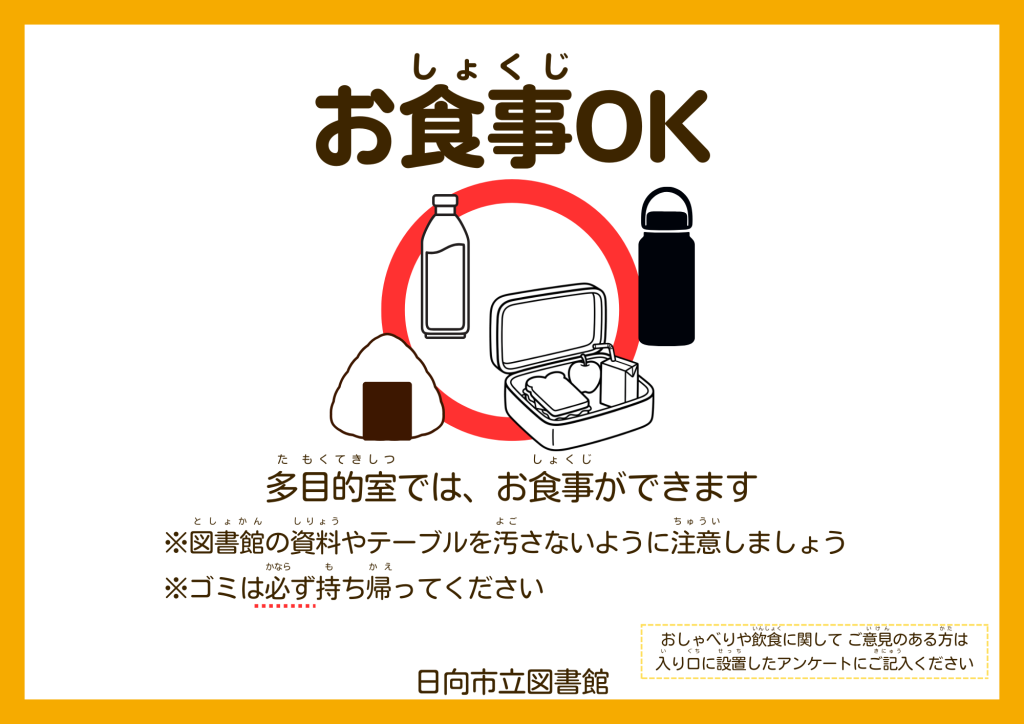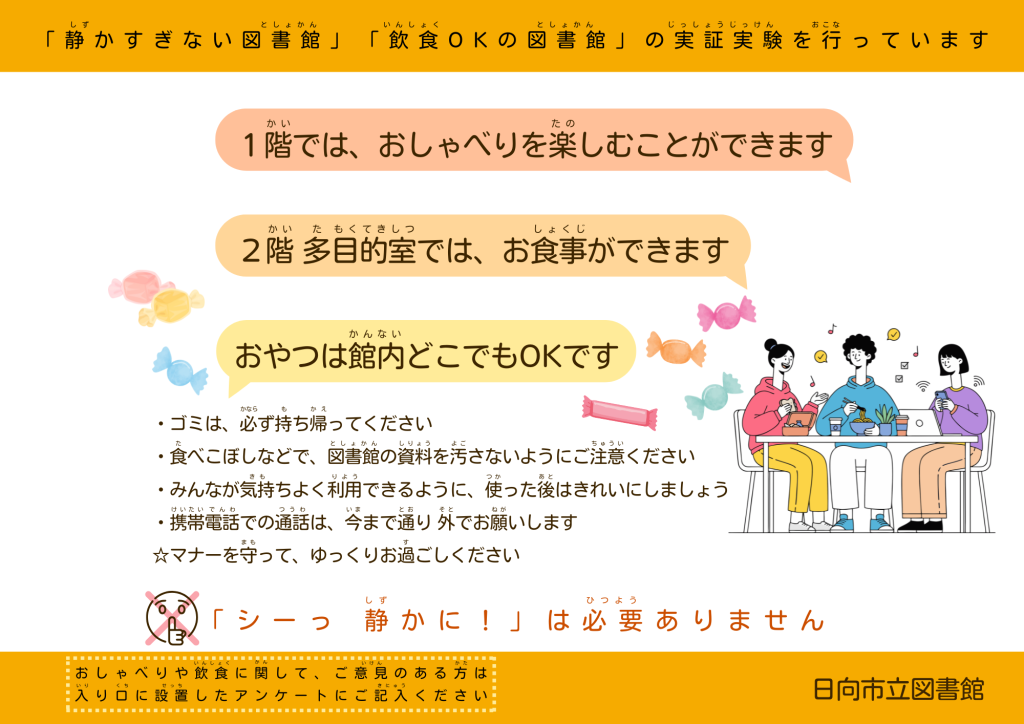 日向市立図書館では、「静かすぎない図書館」「飲食OKの図書館」の実現に向けた実証実験を令和8年1月20日から始めました。