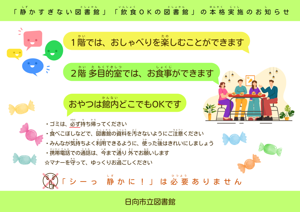 2026.04.01 「静かすぎない図書館」「飲食OKの図書館」の本格実施のお知らせ 午前9時~午後7時 毎週月曜日(月曜日が祝日の場合は開館し、次の平日を休館日とする) 年末年始 特別図書整理(蔵書点検)期間 PREV2026年 4月NEXT日月火水木金土29303112345678910111213141516171819202122232425262728293012 休館日 大きなカレンダー としょかんニュース 視聴覚ライブラリ 所蔵雑誌・新聞 雑誌スポンサー募集 ボランティアサークル 日向市史の販売