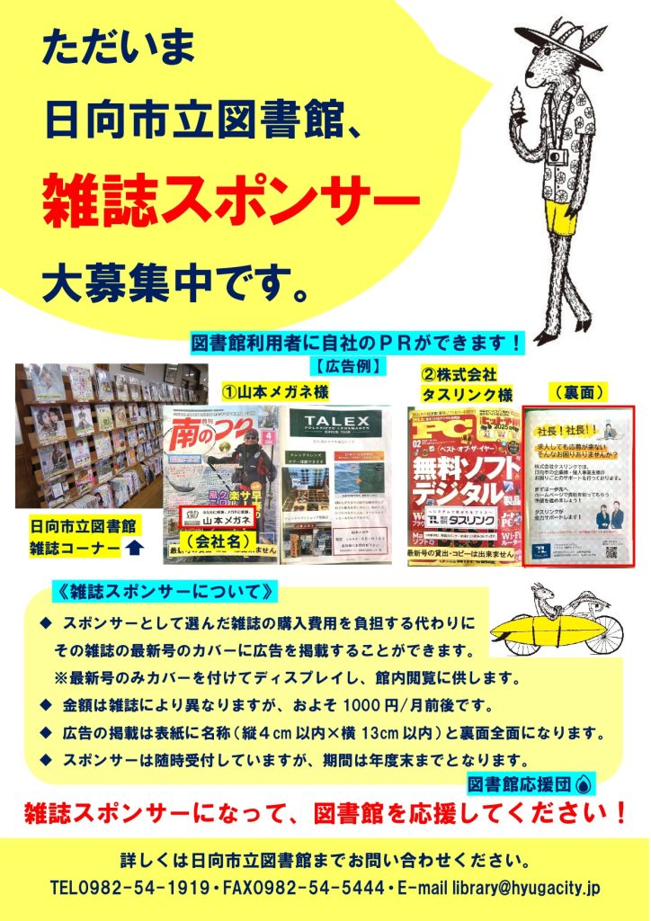 日向市立図書館では、限られた予算の中で多様化するニーズに応えるため、令和4年度から雑誌スポンサー制度を取り入れております。企業や団体様に雑誌のスポンサーとなって雑誌の購入代金をご負担いただく代わりに、雑誌のカバーに広告を掲載するというものです。スポンサーは随時募集しておりますので、ぜひご協力ください。