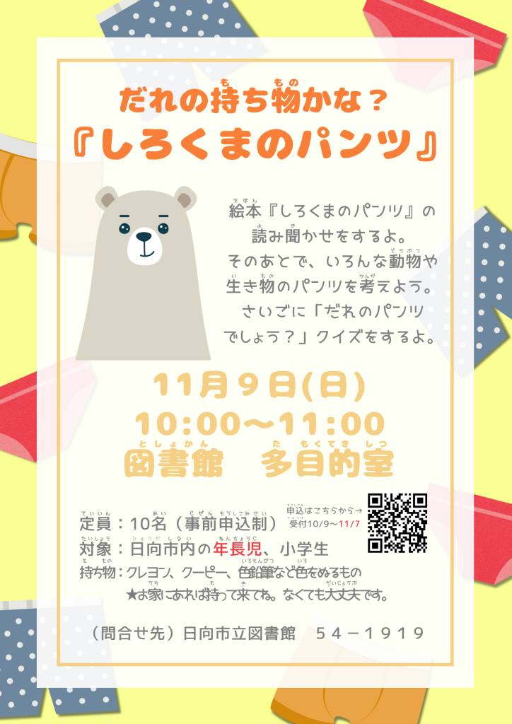 秋のとしょかんまつりでアニマシオンを行います。アニマシオンとは、絵本を楽しく読む方法で、ゲームやクイズを取り入れながら 読書の面白さを体験します。今回は絵本『しろくまのパンツ』が題材です。日向市内の年長児、小学生の申し込みをお待ちしています。