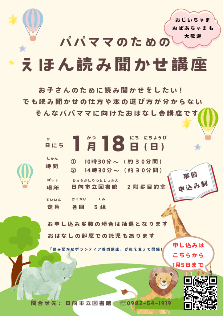 お家で読み聞かせをやってみたい!でも、読み方が分からないから苦手。どんな絵本を読んだらいいのか分からない。そんな経験はありませんか??そこで、ご家庭での読み聞かせについて、図書館職員が簡単な講座を行います。