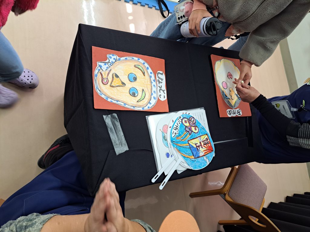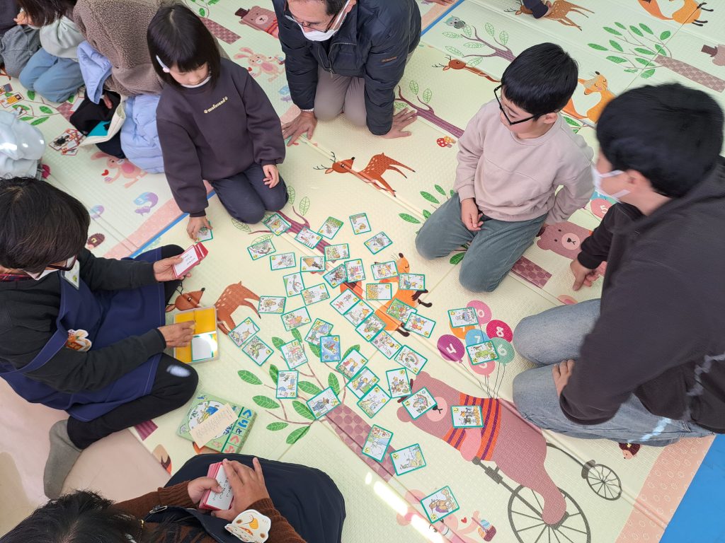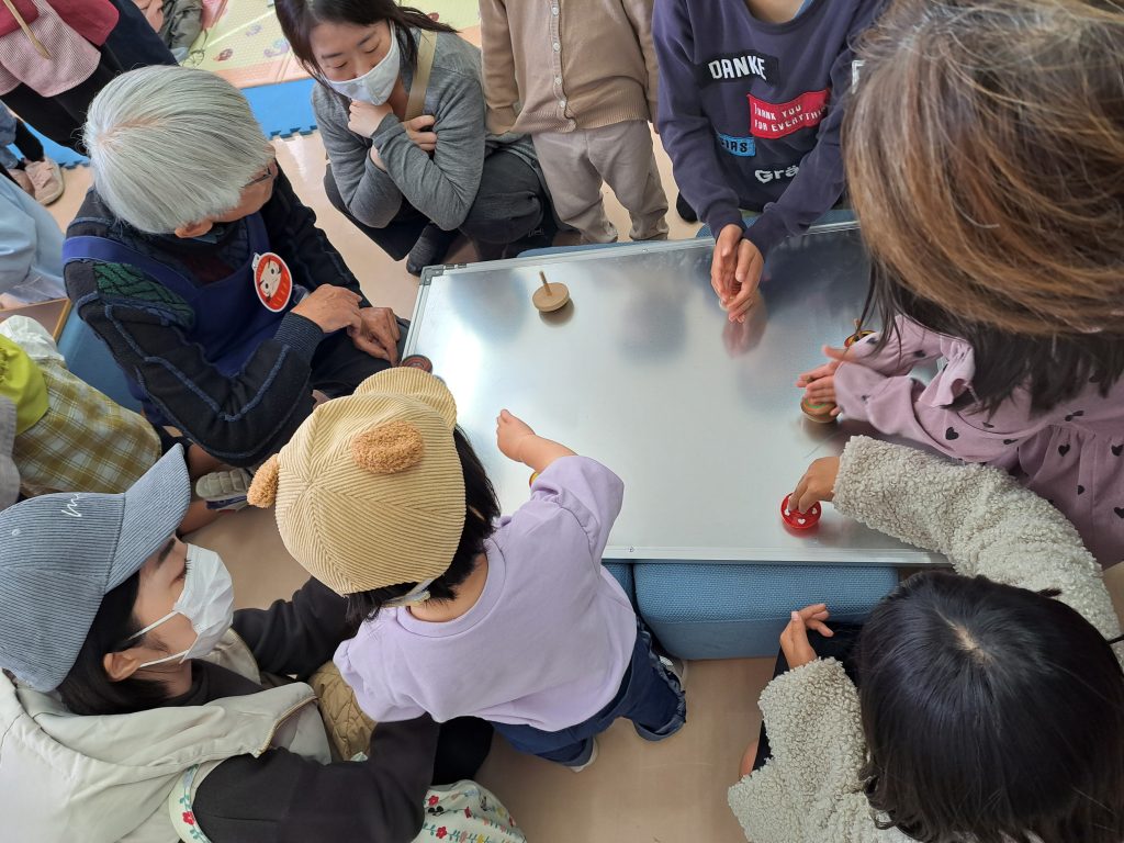 お正月にちなんだおはなしの後に、コマまわし、ふくわらい、かるた、ボードゲームで遊びました。