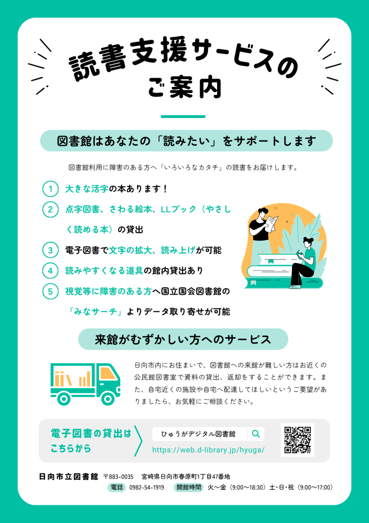 日向市立図書館では、図書館利用に障害のある方へ「いろいろなカタチ」の読書をお届けします。