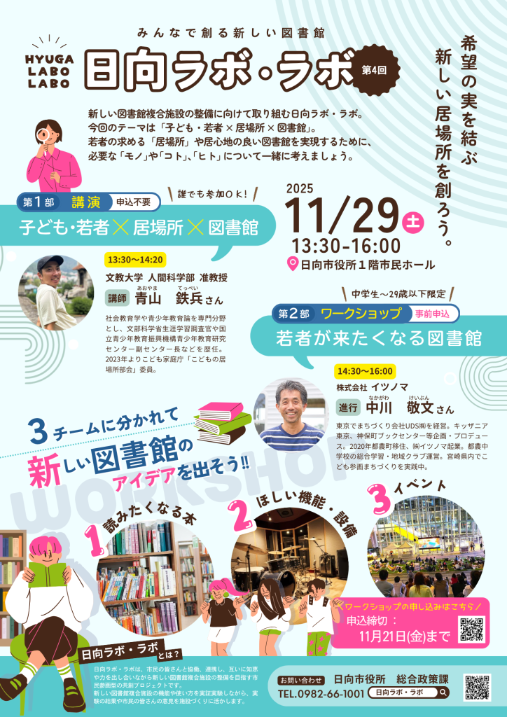 11月29日(土)に第4回「みんなで創る新しい図書館 日向ラボ・ラボ」を開催します。今回は「『若者』が求める図書館」がテーマです。