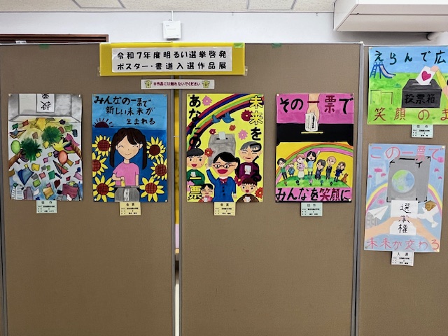 令和7年度 明るい選挙啓発 ポスター・書道入選作品展を日向市立図書館2階廊下で展示しています。合わせて選挙に関する本も展示していますので、ぜひご覧ください。